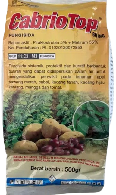 Bahan aktif pada fungisida Cabrio Top merupakan Piraklostrobin 5 % serta Metiram 55 %, yang efektif untuk memberantas penyakit tanaman cabai.